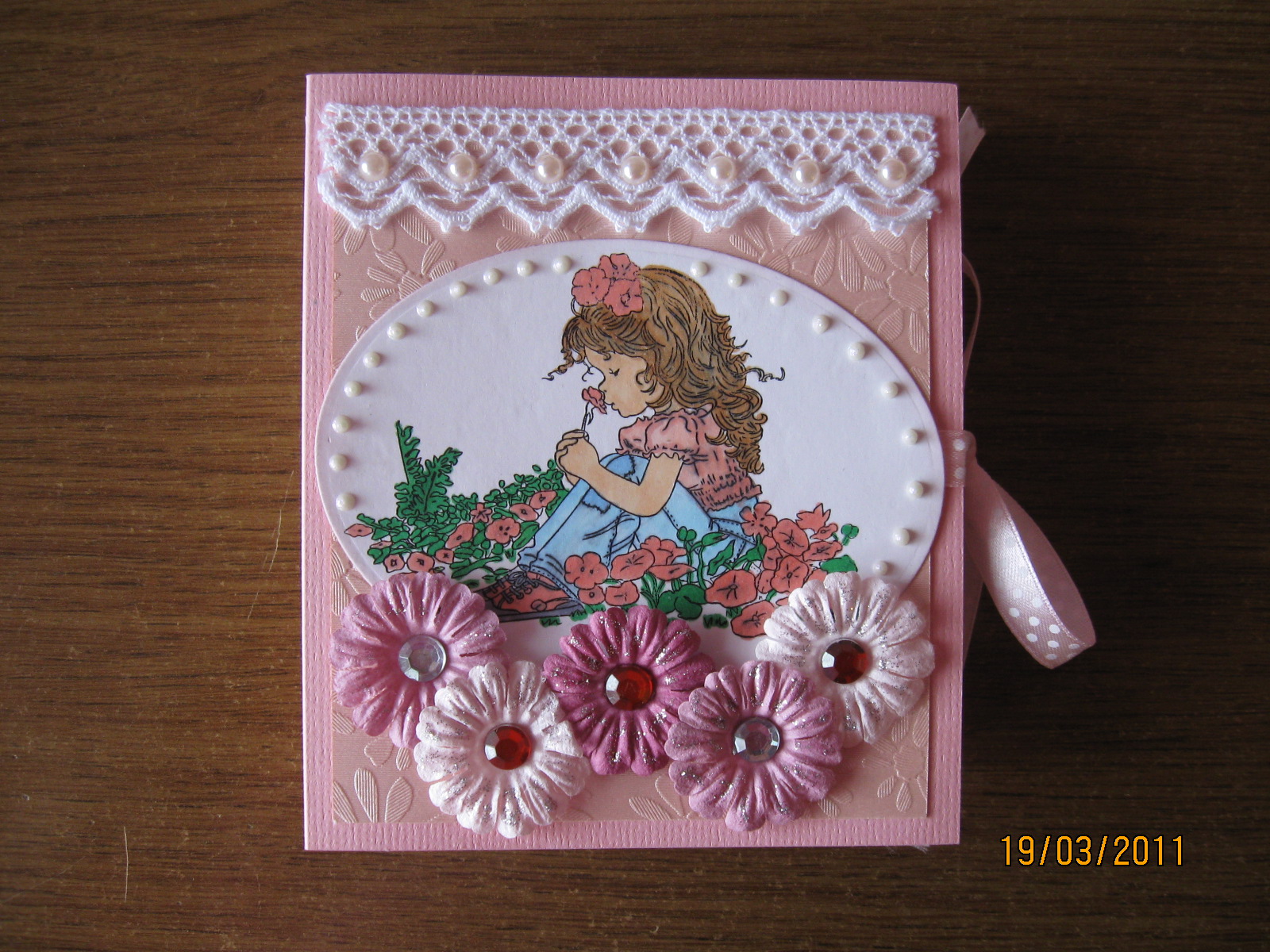 Jaz sem še vedno pri knjigicah. Tokratna knjigica je namenjena nečakinji Luciji, ki je dopolnila 22. let. Osnovna barva je roza oz. zelo svetla lavanda. Nekako sovpada z nežnostjo dekleta. Uporabila sem štampiljko Sarah Kay in jo pobarvala s Copici. Pritrdila čipko in nekaj rožic in nastala je naslednja knjigica.