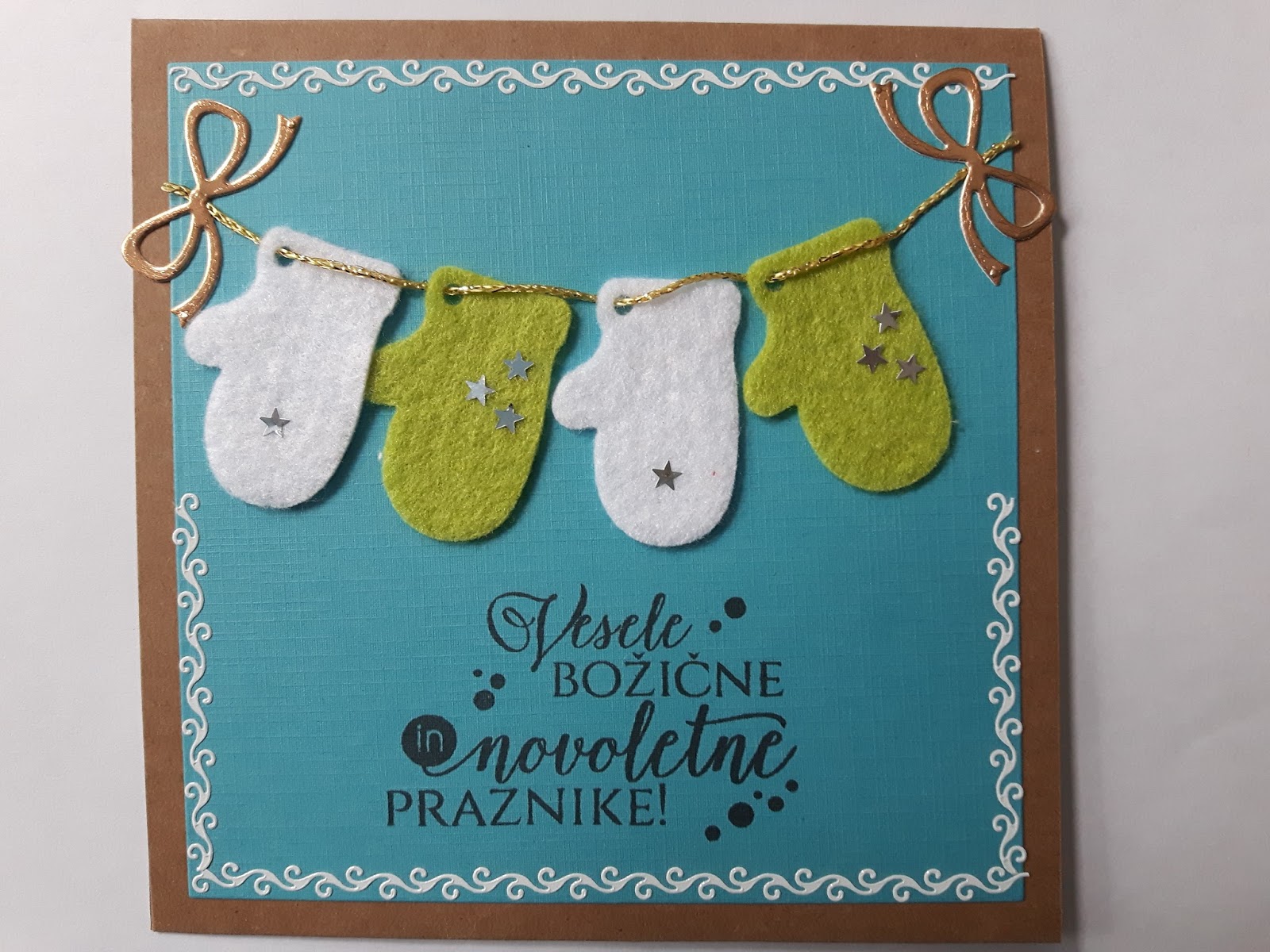 Voščilnice so preproste. Vsaka ima svoj napis - od Ustvarjalnega dotika, Mavelu in Vladke. Rokavičke so izrezane s pomočjo Spellbinders Nestabilities.